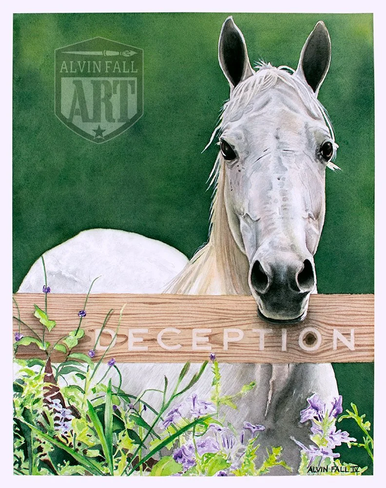 Deception is a commissioned equine portrait of a white horse by the same name, painted in watercolor on Arches 140lb cold press paper.