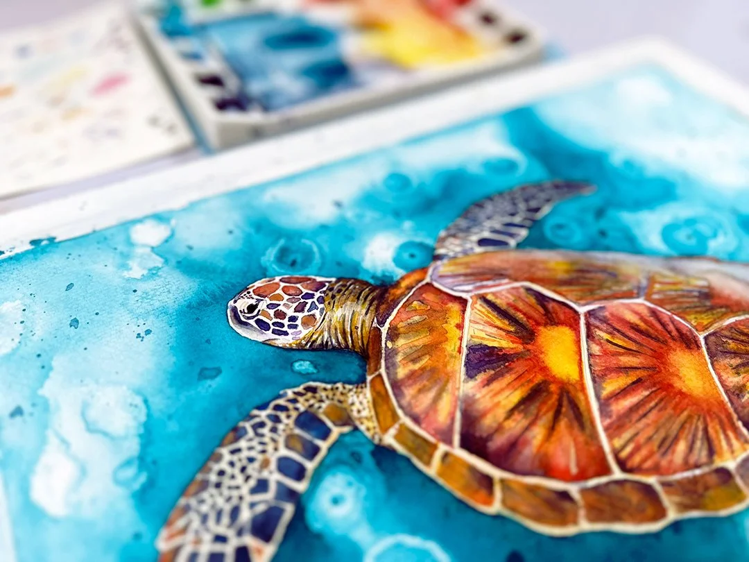 This vibrant watercolor study captures a sea turtle gliding through Florida's turquoise Gulf waters, emphasizing loose, expressive brushwork and bold color harmonies. Created using wet-on-wet techniques that allow the paint to flow and blend naturally, the piece prioritizes spontaneity and emotional impact over precise detail. Part of an ongoing series exploring Florida's coastal wildlife through dynamic watercolor methods.